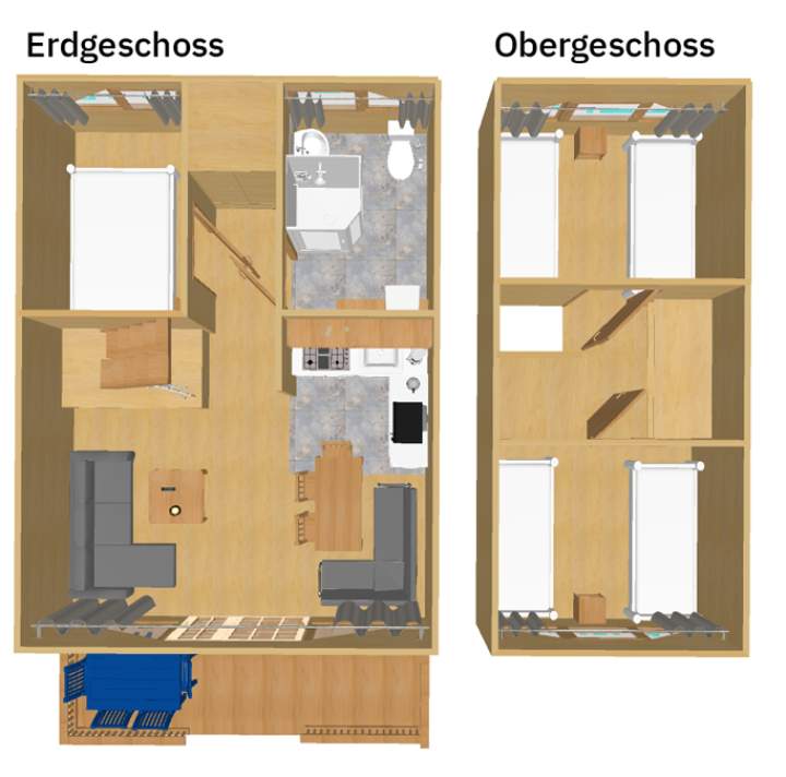 Das Nurdachhaus 302 bietet Platz für 6 Personen mit 3 Schlafzimmern. Im Obergeschoss befinden sich 2 kleinere Schlafzimmer mit jeweils 2 Einzelbetten. Ergänzend hierzu findet man im Erdgeschoss ein Schlafzimmer mit einem Doppelbett. Ausgestattet ist das Ferienhaus mit einem Duschbad und einem Wohn- und Essbereich mit offener Küche. Genießen Sie unvergessliche Ferien inmitten der Natur.