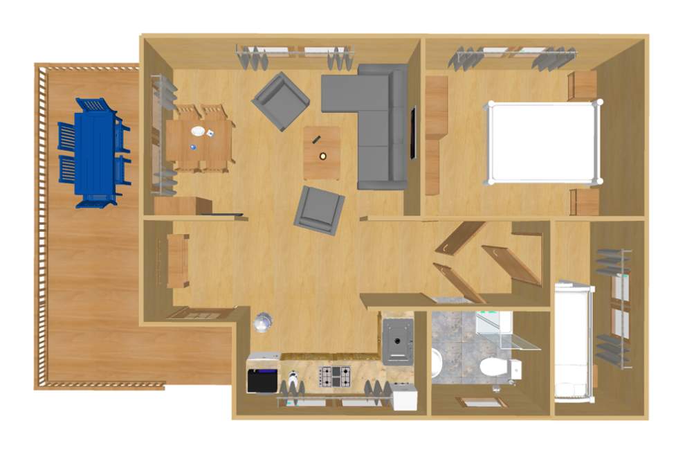 Das Blockhaus 336 bietet Platz für 4 bis 5 Personen, verteilt auf 2 Schlafzimmern. Außerdem erwartet Sie ein Duschbad sowie ein offener Wohn- und Essbereich mit offener Küche. Das Sofa lässt sich zu einem Schlafsofa umfunktionieren. Zum Ententeich bietet das Blockhaus eine überdachte Holzterrasse.