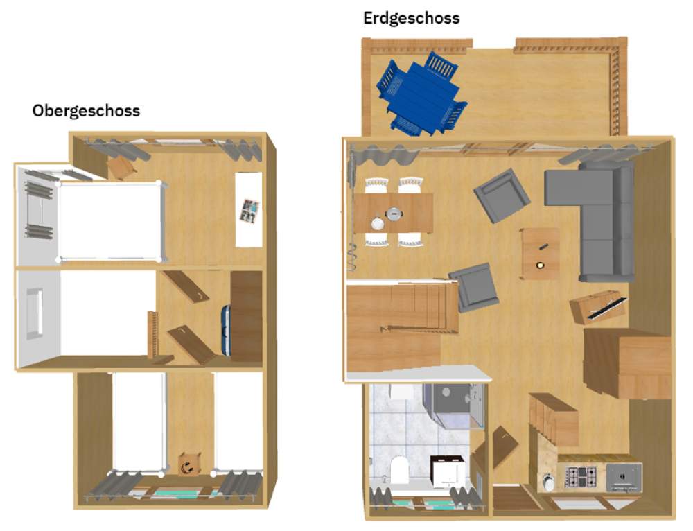 Das Nurdachhaus 340 bietet Platz für 4 bis 6 Personen, verteilt auf 2 Schlafzimmer. Die Schlafzimmer befinden sich im Obergeschoss, wobei eins mit einem Doppelbett und das andere mit 2 Einzelbetten ausgestattet ist. Ergänzend hierzu findet man im Erdgeschoss ein kleines Duschbad sowie den Wohn- und Essbereich. Neben der offenen Küche mit einer Mikrowelle mit Grillfunktion ist hier auch ein Schlafsofa zu finden.