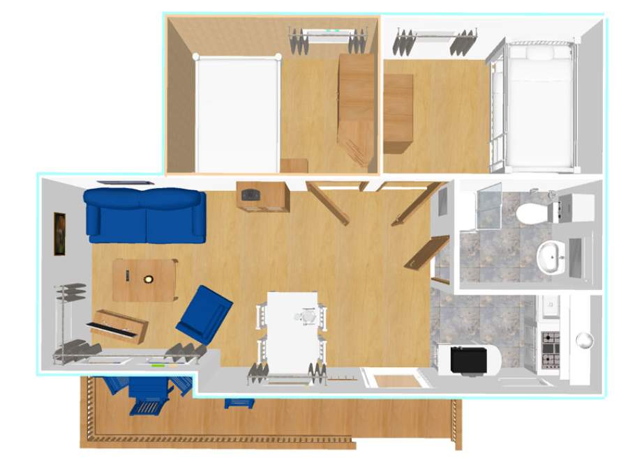 Das Hauptaugenmerk bei den Chalets liegt auf der überdachten Veranda und dem offenen Wohnbereich im Ferienhaus. Der Wohnbereich geht in den Essbereich und die offene Küche über. Neben der offenen Küche ist der Wohnbereich auch mit einer gemütlichen Sofaecke ausgestattet. Durch die kleine Veranda bietet sich eine Möglichkeit den Aufenthalt in der freien Natur zu genießen.